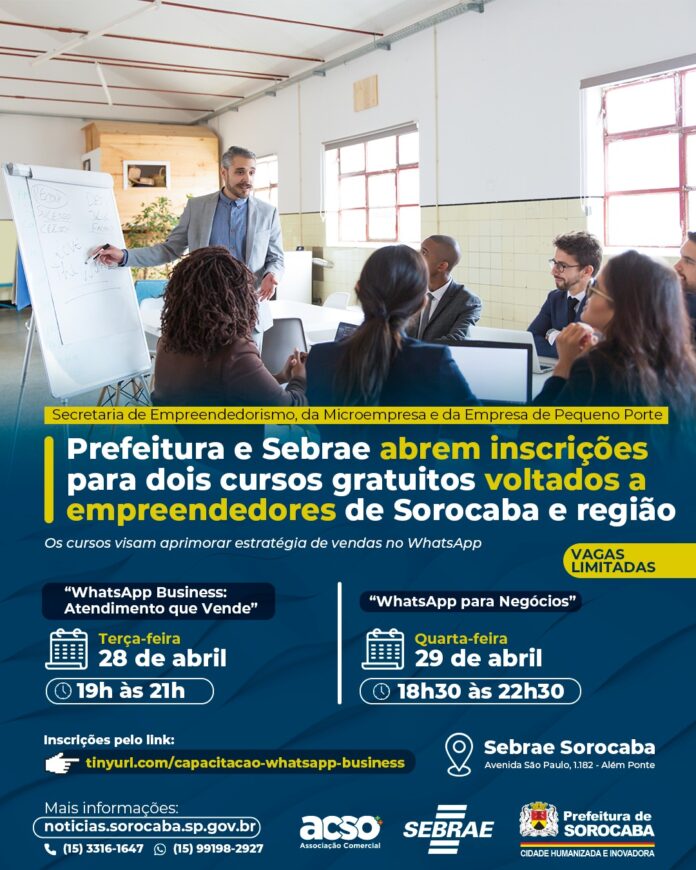 A Prefeitura de Sorocaba, por meio da Secretaria de Empreendedorismo, da Microempresa e da empresa de Pequeno Porte (Semepp), em parceria com o Serviço Brasileiro de Apoio às Micro e Pequenas Empresas (Sebrae), com o apoio da Associação Comercial de Sorocaba (ACSO), está com inscrições abertas para os cursos “WhatsApp Business: Atendimento que Vende” e “WhatsApp para Negócios”. Os cursos visam aprimorar estratégia de vendas on-line.