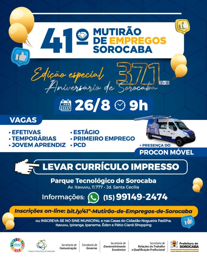 A Prefeitura de Sorocaba, por meio das secretarias de Desenvolvimento Econômico (Sede) e de Relações do Trabalho e Qualificação Profissional (Sert), com o apoio da Secretaria de Governo (Segov), da Secretaria de Comunicação (Secom) e do Parque Tecnológico de Sorocaba (PTS), realizará, no dia 26 de agosto, às 9h, no PTS, a 41ª edição do “Mutirão de Empregos Sorocaba”, desta vez, com o tema especial “Aniversário de Sorocaba”. No local, serão disponibilizadas diversas oportunidades de trabalho, vagas efetivas, temporárias, estágio, entre muitas outras.
