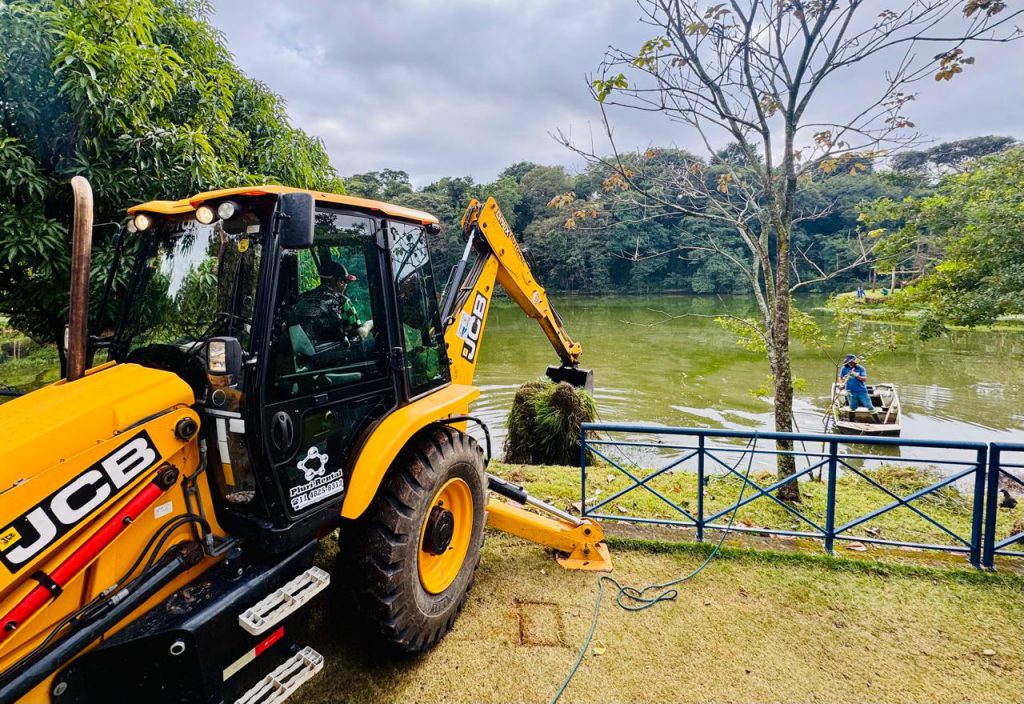 Inclusive, por meio de embarcação, de forma manual, funcionários utilizaram cabo preso a um vergalhão de ganchos, para arrastar a vegetação a um ponto do lago ao alcance da retroescavadeira. A vegetação removida foi descartada no Aterro de Inertes, pela Secretaria de Serviços Públicos e Obras (Serpo), em caminhão próprio.