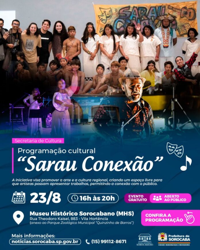 Neste sábado (23), os sorocabanos poderão conferir o “Sarau Conexão” com uma programação cultural gratuita no Museu Histórico Sorocabano (MHS). As atrações ocorrerão das 16h às 20h, com apresentações de música, dança, teatro, entre outras formas de arte, de artistas locais.