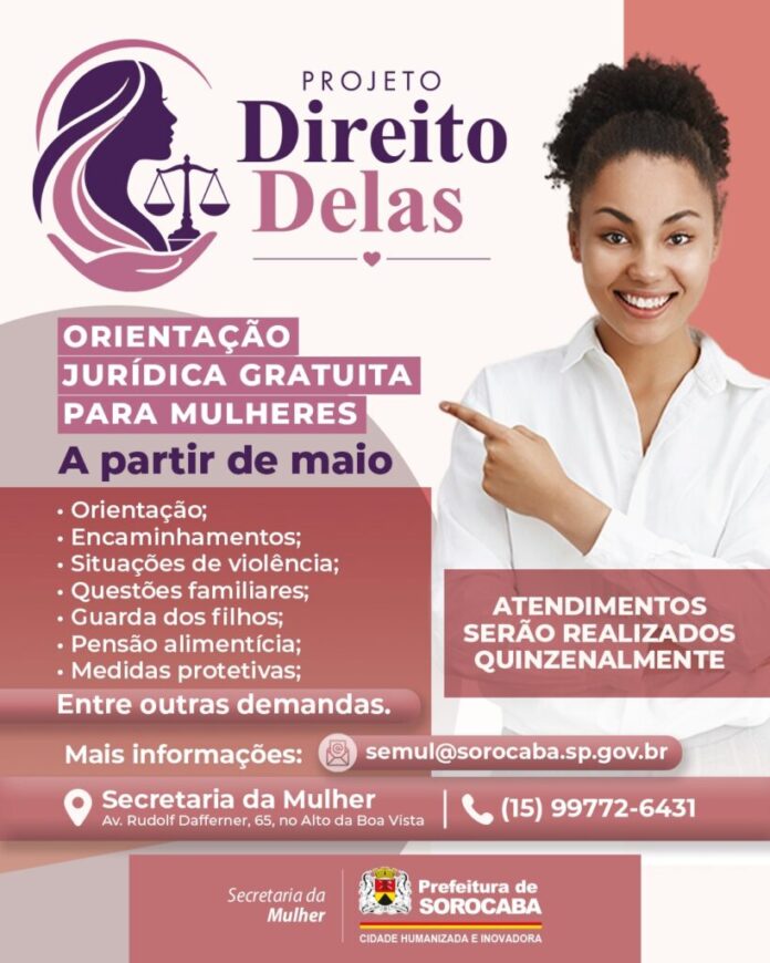 A Prefeitura de Sorocaba, por meio da Secretaria da Mulher, passará a oferecer, a partir do mês de maio, orientação jurídica gratuita para mulheres. Trata-se do projeto “Direito Delas” e o objetivo é oferecer atendimento jurídico acessível às mulheres, com foco em orientação, esclarecimento de dúvidas e encaminhamentos relacionados a direitos, especialmente em situações de violência, questões familiares, como guarda dos filhos, pensão alimentícia, medidas protetivas, entre outras demandas.