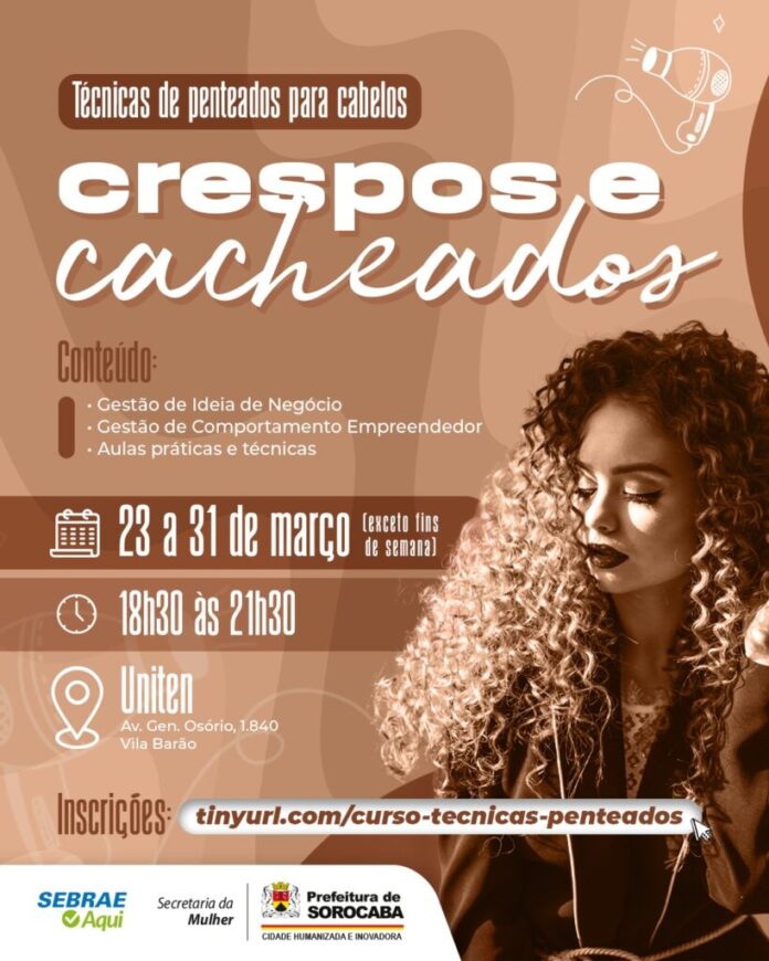 A Prefeitura de Sorocaba, por meio da Secretaria da Mulher (Semul), abriu as inscrições para o curso de penteados para cabelos afro, que ocorrerá de 23 a 31 de março, das 18h30 às 21h30, exceto fins de semana, na Universidade do Trabalhador, Empreendedor e Negócios (Uniten), que está localizada na Av. General Osório, 1.840, na Vila Barão. As vagas são limitadas e para se inscrever basta acessar o link: https://agenda-eventos.sorocaba.sp.gov.br/tecnicas-de-penteados-para-cabelos-crespos-e-cacheados/.