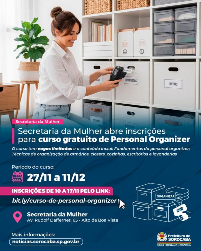 As vagas são limitadas e serão preenchidas por ordem de inscrição, que podem ser feitas do dia 10 a 17 de novembro, pelo link: bit.ly/curso-de-personal-organizer. A formação inclui a entrega de certificados.