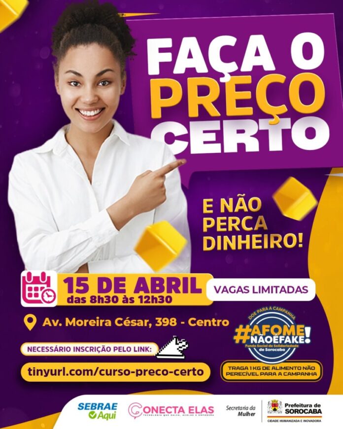 A Prefeitura de Sorocaba, por meio da Secretaria da Mulher (Semul) e em parceria com o Sebrae Aqui, abriu as inscrições para o curso “Faça o Preço Certo – E não perca dinheiro”, que será no dia 15 de abril, das 8h30 às 12h30, no Espaço 360°, localizado na Av. Moreira César, 398, no Centro. As vagas são limitadas e para se inscrever basta acessar o link: tinyurl.com/curso-preco-certo.