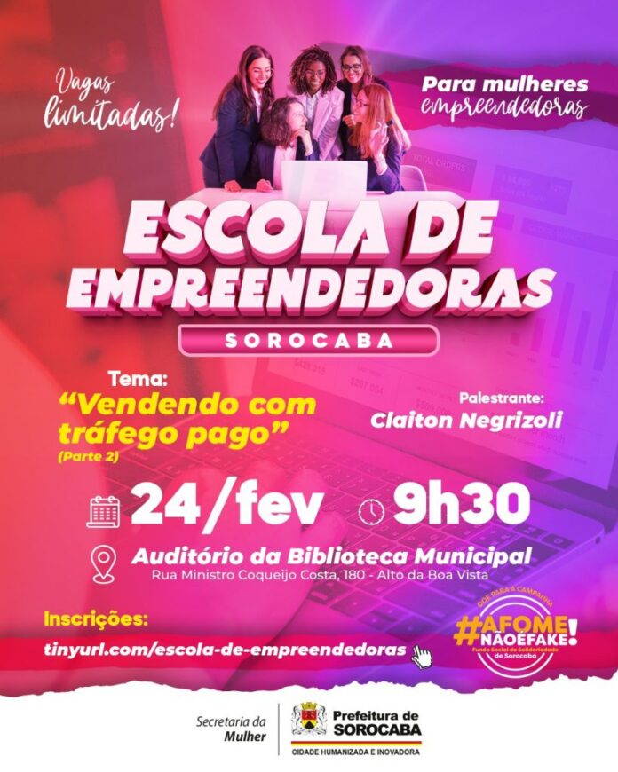 O workshop será realizado no próximo dia 24 de fevereiro, uma terça-feira, às 9h30, no auditório da Biblioteca Municipal de Sorocaba, com o palestrante Claiton Negrizoli. Os encontros do programa Escola de Empreendedoras acontecerão mensalmente, toda última terça-feira do mês, para que as participantes possam aprender com profissionais da área e melhorar suas vendas, usando o conhecimento a seu favor.