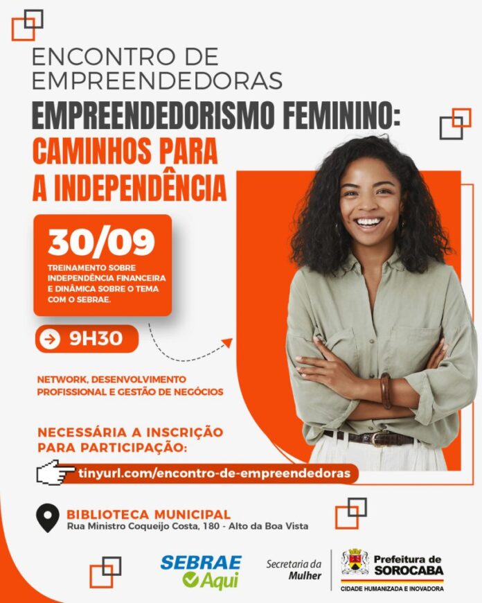 A Prefeitura de Sorocaba, por meio da Secretaria da Mulher (Semul), em parceira com o Sebrae Aqui, vai realizar, no próximo dia 30 de setembro, uma terça-feira, às 9h30, o Encontro de Empreendedoras, com o tema: Caminhos para a independência. As inscrições estão abertas e podem ser feitas online, pelo link: tinyurl.com/encontro-de-empreendedoras