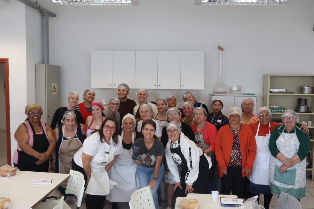 Angélica Hubner, do Instituto Vida Confeiteira, foi mais uma vez a instrutora do curso, oferecendo seu conhecimento e experiência em prol do grupo de mulheres vindas de várias regiões da cidade.