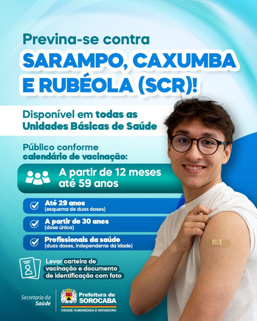 A Secretaria Municipal da Saúde (SES) de Sorocaba informa à população sobre a importância da vacinação contra Sarampo, Caxumba e Rubéola (SCR). O imunizante está disponível em todas as Unidades Básicas de Saúde (UBSs) da cidade.
