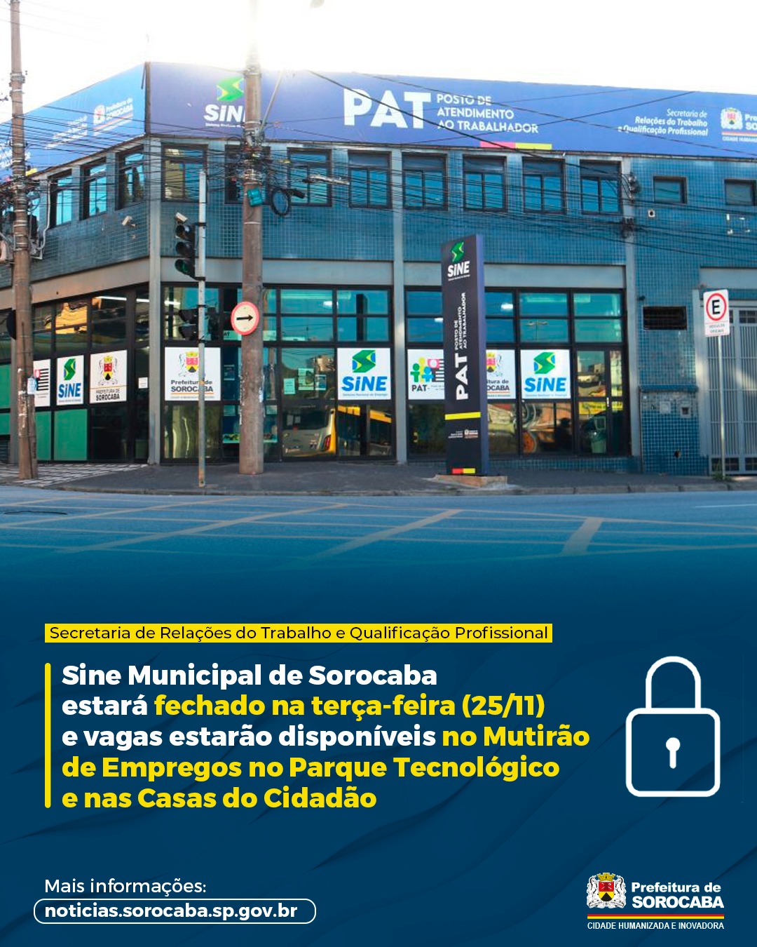 Excepcionalmente, nesta terça-feira (25), o Sine Municipal de Sorocaba estará fechado, para a realização do 44º Mutirão de Empregos, no Parque Tecnológico, localizado na Avenida Itavuvu, 11.777, no Jardim Santa Cecília.