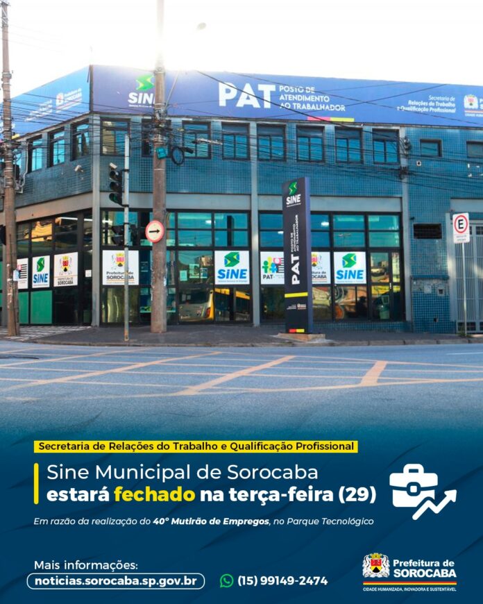 Excepcionalmente, na terça-feira (29), o Sine Municipal de Sorocaba estará fechado para a realização do 40º Mutirão de Empregos, no Parque Tecnológico, localizado na Avenida Itavuvu, 11.777, no Jardim Santa Cecília.