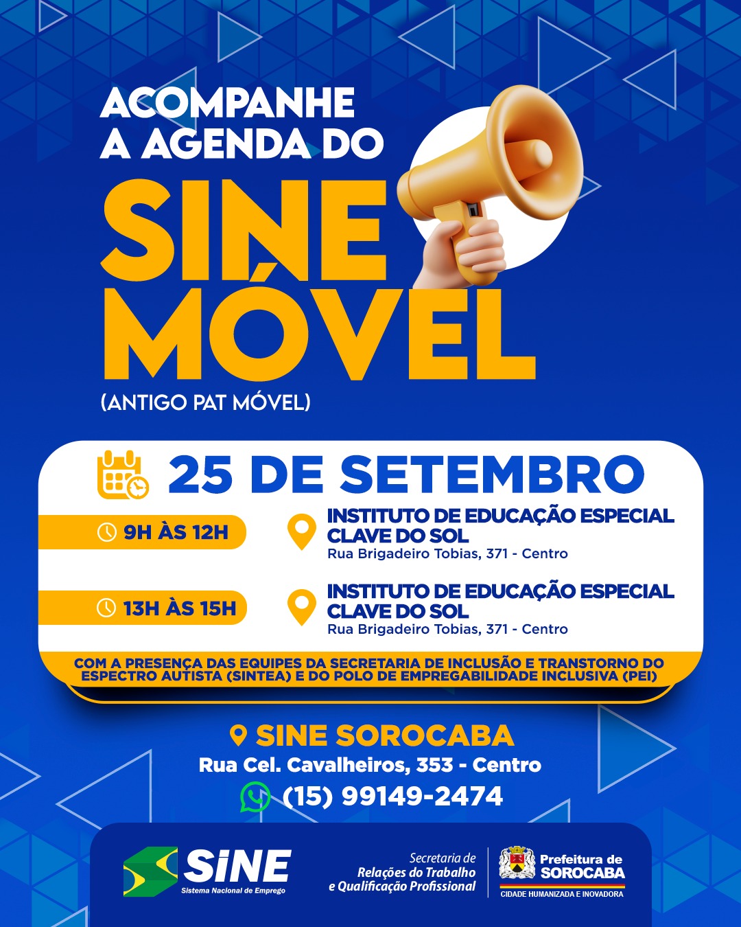 A Prefeitura de Sorocaba, por meio do Sine Móvel, unidade itinerante do Sine Municipal de Sorocaba, ligado à Secretaria de Relações do Trabalho e Qualificação Profissional (Sert), realizará, nesta quarta-feira (25), ação social de empregabilidade no Instituto de Educação Especial “Clave do Sol”, localizado no Centro. A iniciativa, que acontece das 9h às 12h e das 13h às 15h, oferece vagas de trabalho inclusivas, tanto para o público atendido na creche quanto para a população em geral da região.