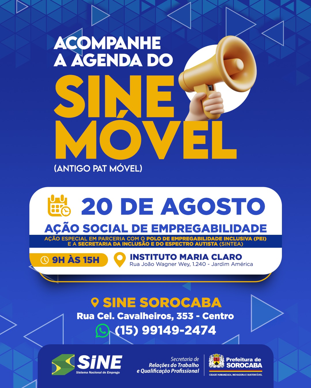 A Prefeitura de Sorocaba, por meio do Sine Móvel, unidade itinerante do Sine Municipal de Sorocaba, ligado à Secretaria de Relações do Trabalho e Qualificação Profissional (Sert), nesta quarta-feira (20), uma ação social de empregabilidade no Instituto Maria Claro, localizada no Jardim América, Zona Sul da cidade.
