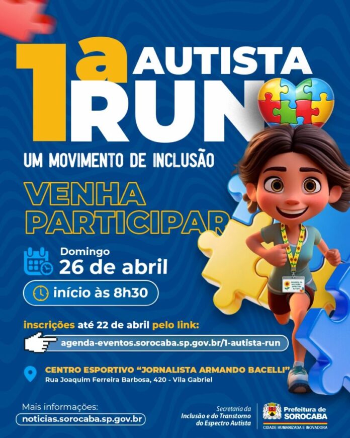 O evento será no dia 26 de abril, às 8h30, no Centro Esportivo “Jornalista Armando Bacelli”, localizado na Rua Joaquim Ferreira Barbosa, 430, na Vila Gabriel. As inscrições já estão abertas e podem ser feitas pelo link: agenda-eventos.sorocaba.sp.gov.br/1-autista-run.