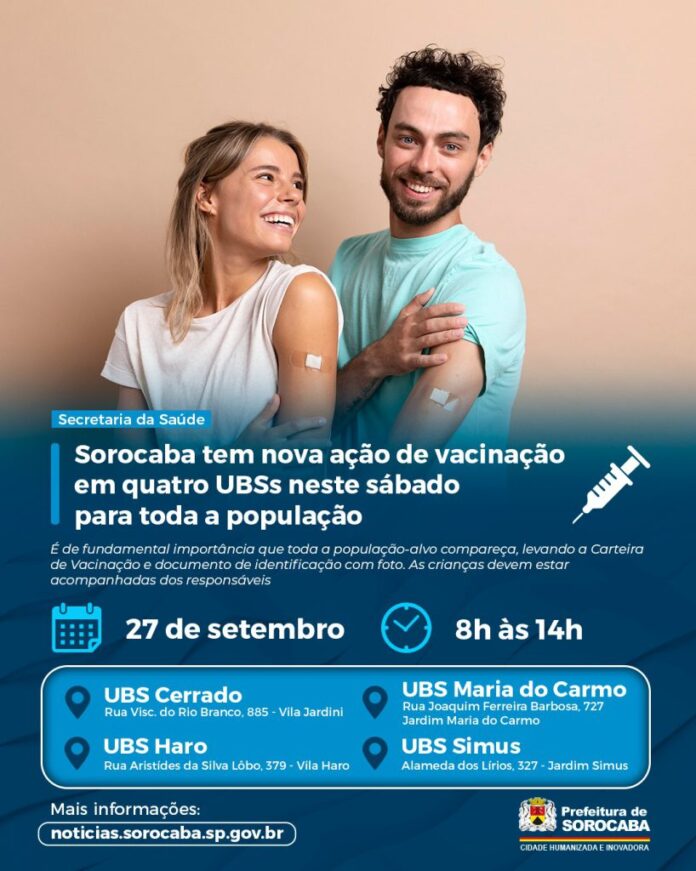 Com o intuito de sempre ampliar a oferta de vacinação aos munícipes, principalmente àqueles que não conseguem se imunizar durante a semana, o Município de Sorocaba ofertará mais uma possibilidade de atualização da Carteira de Vacinação para todo população, neste sábado (27), das 8h às 14h, em quatro Unidades Básicas de Saúde (UBSs): Cerrado, Haro, Maria do Carmo e Simus.