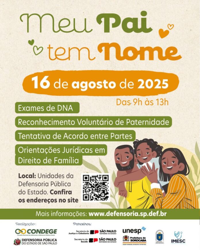 A Defensoria Pública do Estado de São Paulo, com apoio institucional da Prefeitura de Sorocaba, realizará, neste sábado (16), das 9h às 13h, na Unidade da Defensoria Pública, um mutirão intitulado “Meu Pai Tem Nome” com uma série de serviços para assegurar o direito à paternidade registral e a direitos correlatos.