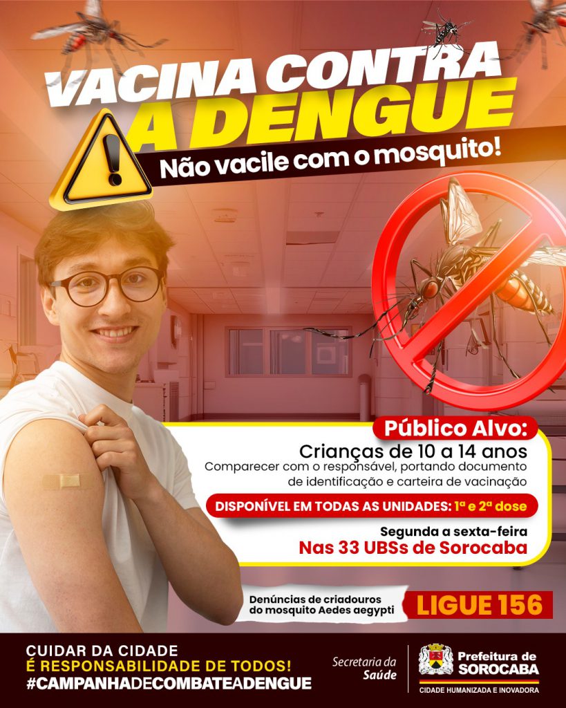 Sorocaba mantém à disposição, para o público de 10 a 14 anos, de segunda a sexta-feira, a vacinação contra a dengue nas 33 Unidades Básicas de Saúde (UBSs) da cidade para primeira e segunda dose.