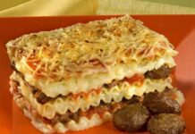 – Alterne as camadas de molhos, massa, hamburguinhos e fatias de mussarela da seguinte forma: molho de batata, fatias de mussarela, tiras de lasanha, molho de tomate, hamburguinhos, tiras de lasanha, molho de batata, fatias de mussarela, tiras de lasanha, molho de tomate, hamburguinhos, tiras de lasanha, molho de batata, molho de tomate e finalmente queijo parmesão.