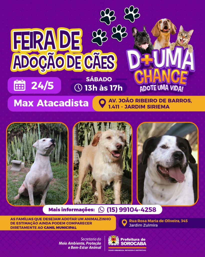 Para quem deseja adotar um pet, o Canil Municipal, localizado na Rua Rosa Maria de Oliveira, 345, ao lado do Instituto Humberto de Campos, no Jardim Zulmira, está com as portas abertas sempre de segunda a sexta-feira, das 9h às 16h. Mais informações pelo WhatsApp: (15) 99104-4258 ou pelo telefone: (15) 3202-8006. Os munícipes também podem conhecer animais disponíveis para adoção na rede social da campanha Divulga Pet: @divulgapetsorocaba.